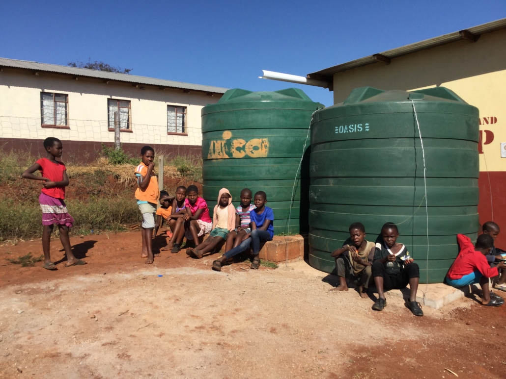 Ohne trinkbares Wasser, breiten sich Krankheiten z.T. rasend schnell aus und führen zu einer hohen Kindersterblichkeit. Brunnen zu bohren ist teuer und in einer Bergregion ohne Wasser-Kartografierung zudem Glückssache. Auch der Klimawandel hat in Eswatini katastrophale Auswirkungen. 2014 gab es sechs Monate lang keinen Regen, 2015 fehlte er sogar von April bis Dezember, 2016 gab es überhaupt keinen Regen. Setzt der Regen schließlich ein, dann sintflutartig, Straßen werden unbefahrbar und Hütten unbewohnbar. Mit Regenwassertanks könnte man diese Starkregen allerdings auch nutzen, um auf einen Schlag tausende Liter Wasser zu sammeln. Mit Unterstützung durch das Bundesministerium für wirtschaftliche Zusammenarbeit ist es gelungen, im Jahr 2015 an unseren sämtlichen einhundert Neighbourhood Carepoints jeweils einen 5000-L-Wassertank zu installieren. Damit steht nun für die Kinder bis in die Trockenzeit hinein Wasser zum Kochen, Händewaschen und z.T. zur Bewässerung der Gärten zur Verfügung.